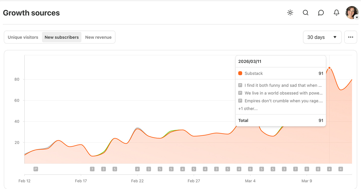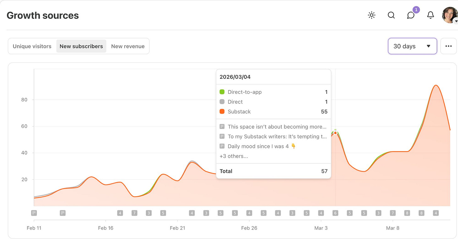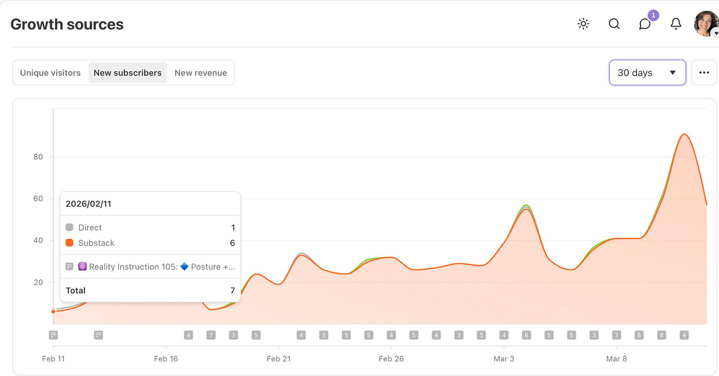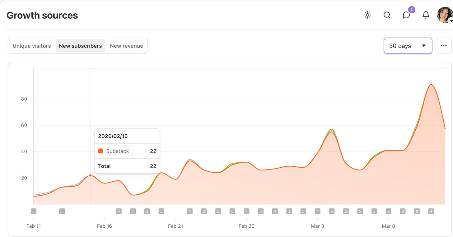 I started actively posting and engaging my audience again around Feb 1st, 2026. After 11 days of activity, I was still seeing under 10 new subscribers a day.