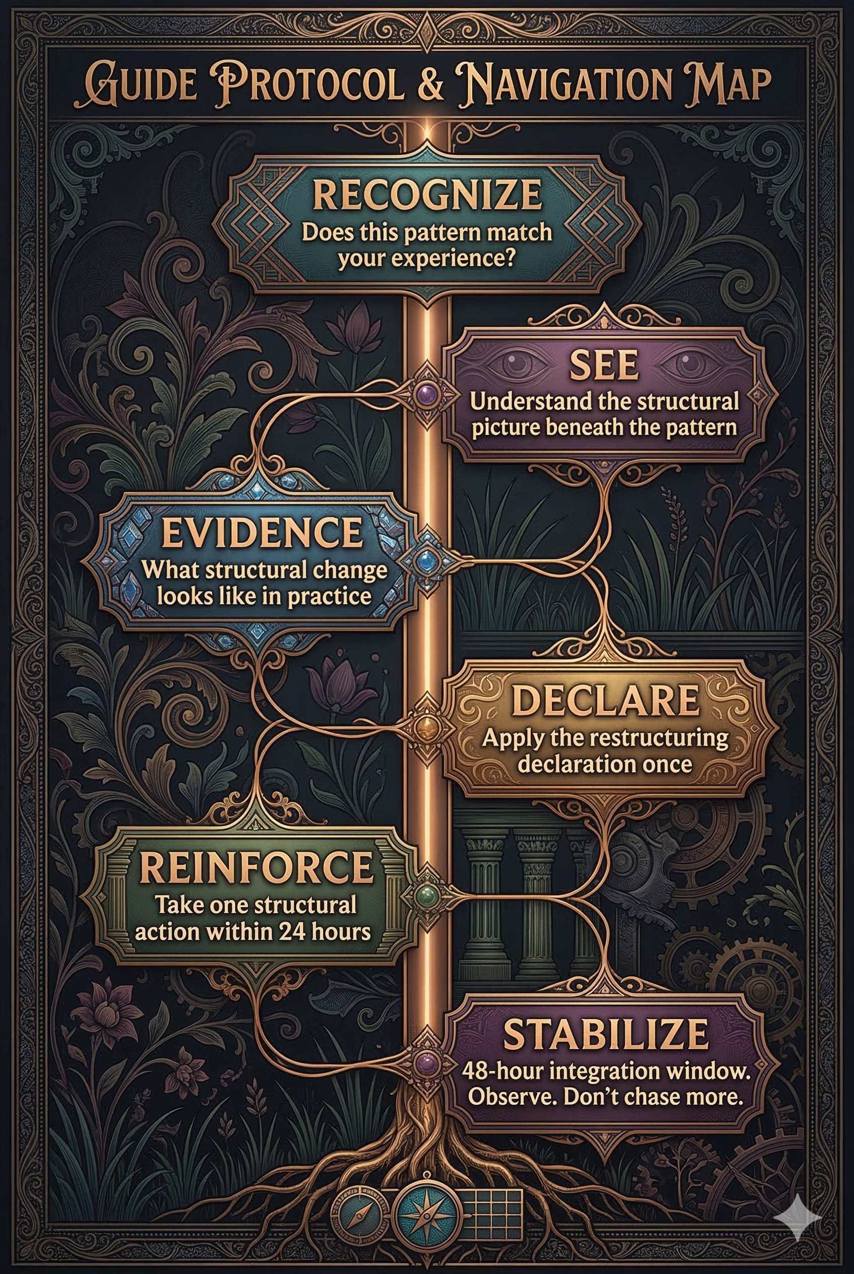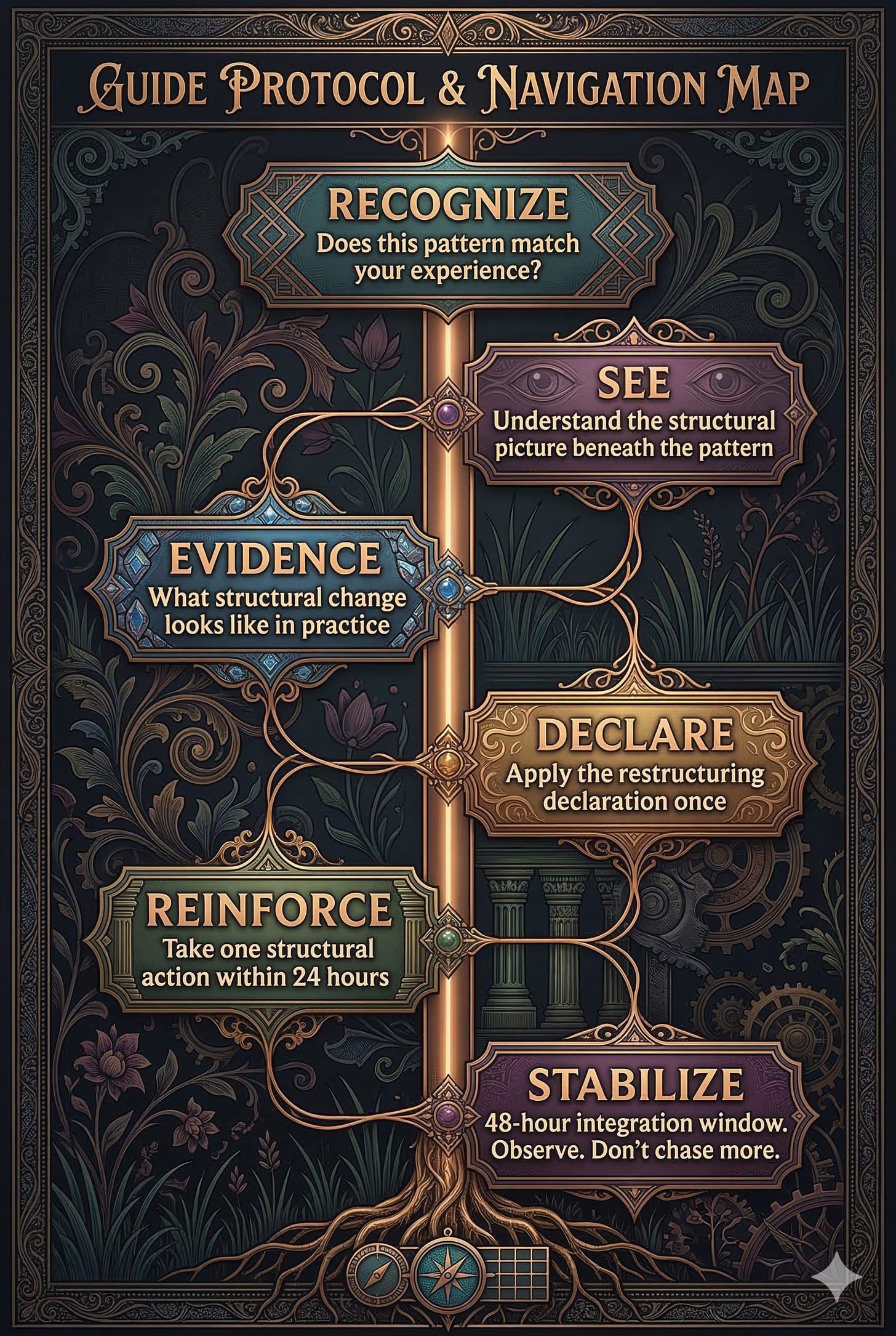 The entire restructuring protocol, including specific aligned micro-actions to take to lock this into matter and money.