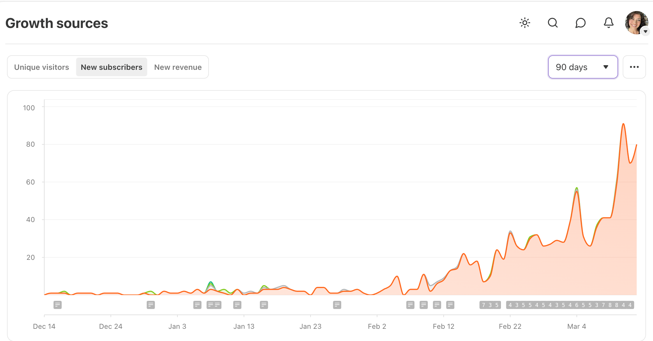 These graphs show how many people subscribed to my publication on a given day, over the last 90 days.